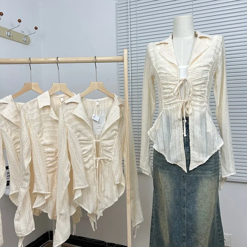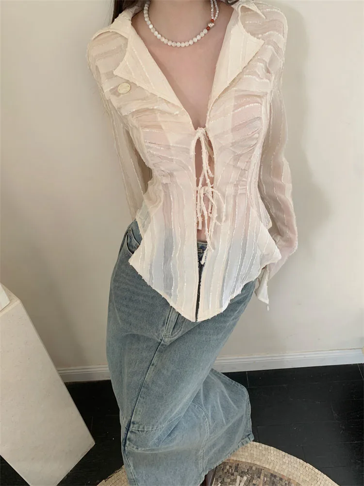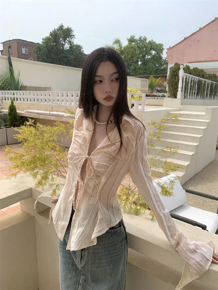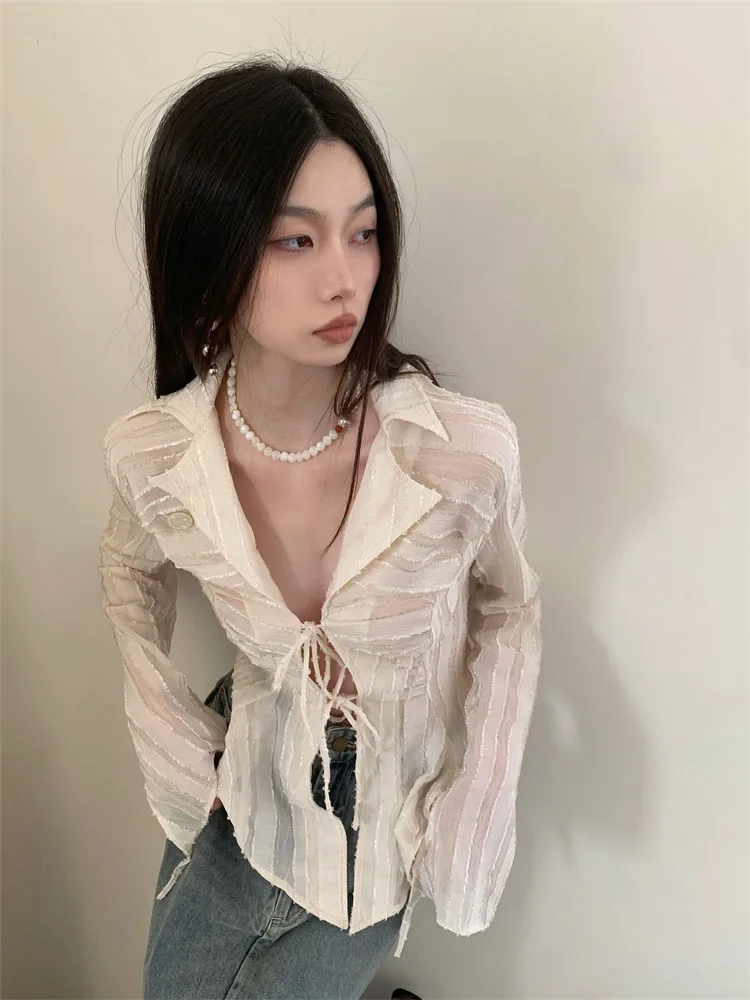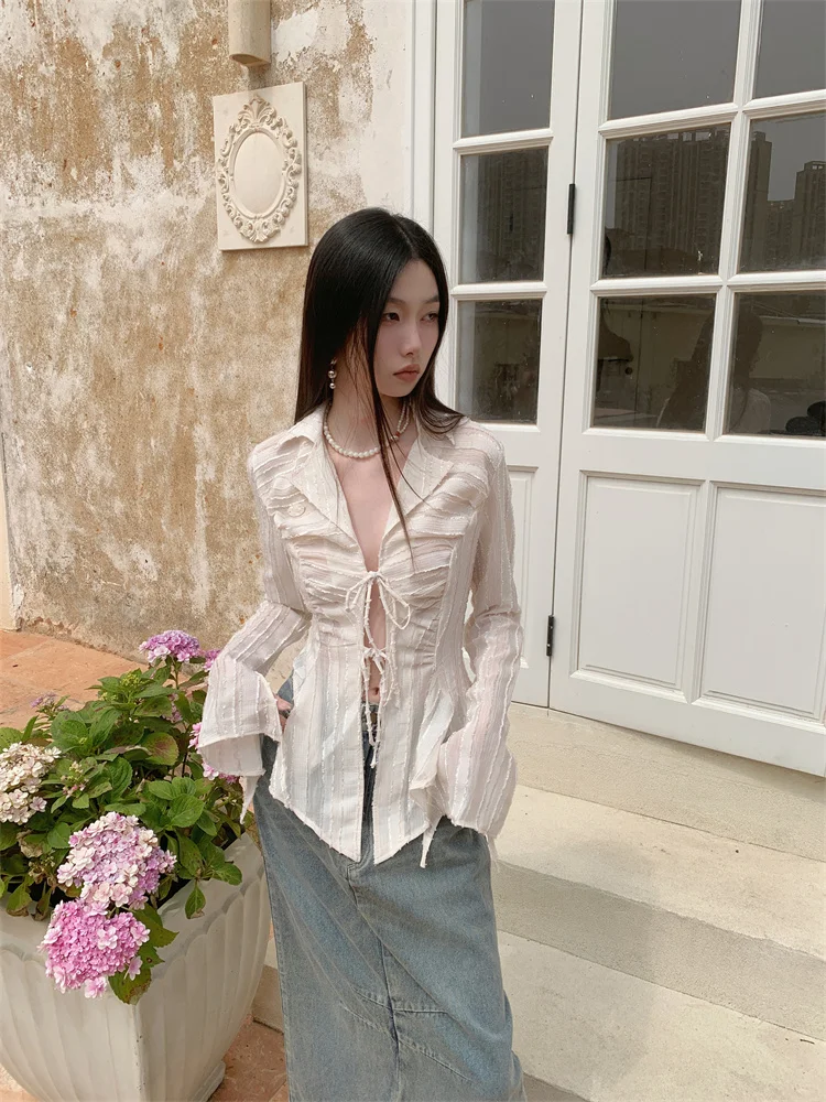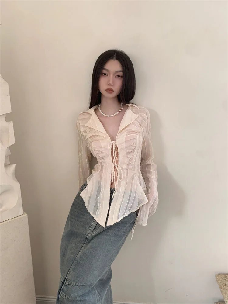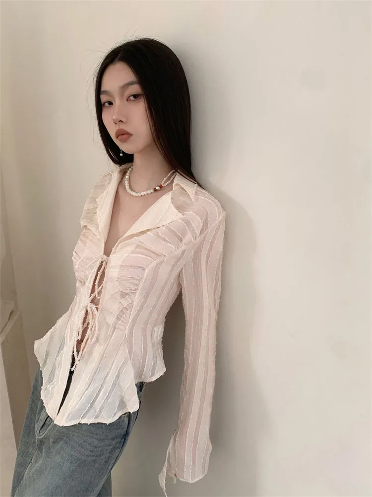 Fairycore Lace Up Blouse Women Long Sleeve Spring New Turn-down Collar Women Shirt Ladies Tops Korean Fashion best online shop womenshophouse free shipping